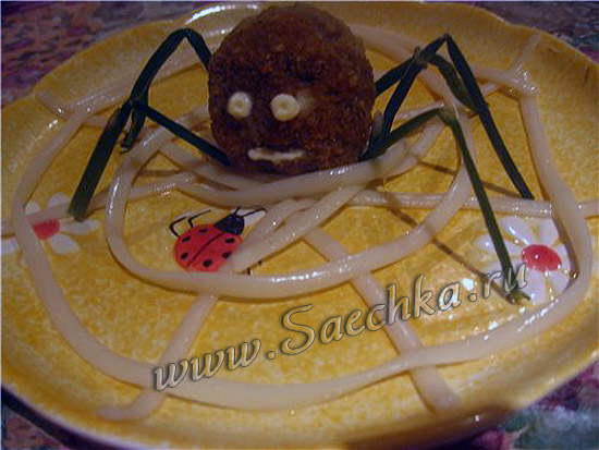 - Взрослые могут уже угощаться, ну а для маленьких капризуль готовим сказочную тарелочку, делаем паутинку из макарон или картофельного пюре (через шприц), в центр высаживаем нашего "паучка", делаем глазки и ротик из сметаны, ножки из стеблей укропа (петрушки, зеленого лука) - детская котлета в виде паучка готова!