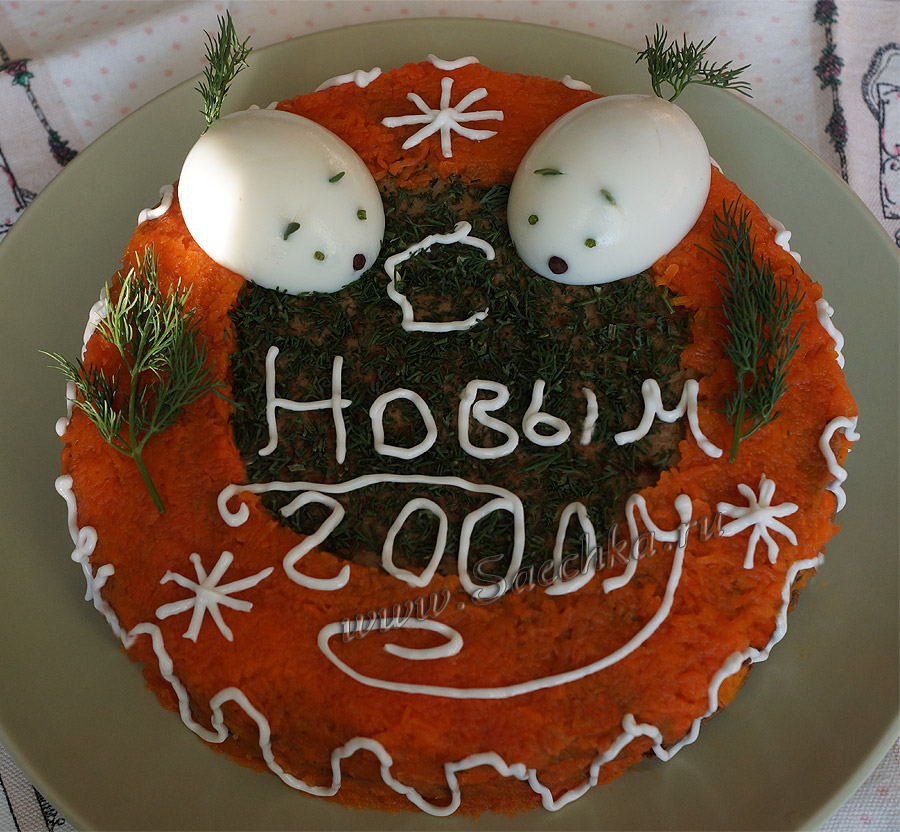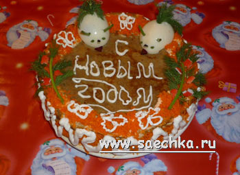 - Украсить печёночный тортик фаршированными «мышками» из яйца, предварительно посыпав верхний блин измельчённым укропом и морковкой. Новогодняя надпись и снежинки сделаны майонезом, выдавленным из пакетика с небольшой дырочкой.