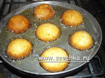 - Огонь под формой самый тихий! Берегите пальцы рук, можно легко обжечься! И смотрим... шарик на глазах в размере увеличивается, подрумянивается, тут двумя ложками его перевернете! Пекутся пончики быстро.