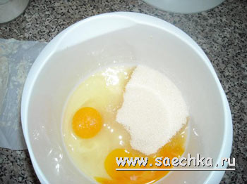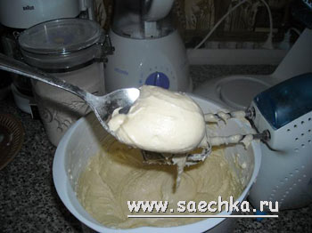 - Из сахара, соли, соды, яиц миксером замешиваем тесто - недолго. Добавляем творог и постепенно вводим муку.