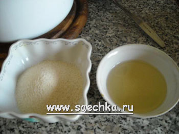 - Для этого в две небольшие посудинки наливаем подсолнечное масло и насыпаем манку: