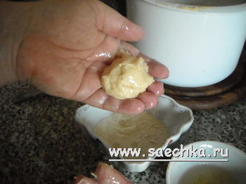 - Для этого руки (особенно ладошки) хорошо смачиваем маслом, рукой берём тесто и пытаемся скатать (слепить) шарик. Первый всегда кривобокий, дальше дело пойдет лучше!