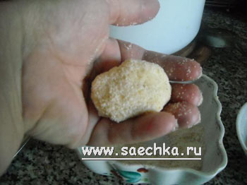 - Тесто как густая сметана, шарик слепился (он очень-очень мягкий!), обмакиваем его в манку (покрутим) и сразу же в масло!