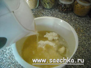 - В чайник влить 250 мл воды, вскипятить, затем из чайника кипяток вылить в форму для замешивания теста (перелить быстро), сразу же в кипяток влить масло, добавить соль и половину муки.