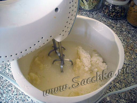 - Размешивать миксером насадками для теста. Сначала тесто довольно комковатое, но очень быстро становится однородным и гладким.