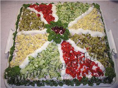 - Украшаем закусочный торт с колбасой на свое усмотрение.