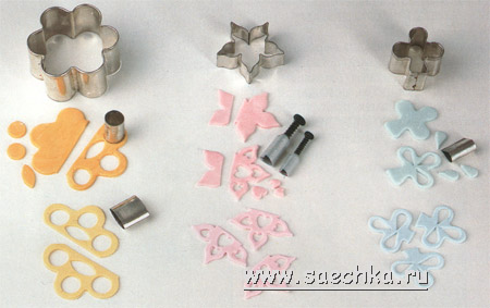 - Из лепестковой помадки можно вырезать самые разнообразные украшения, поэтому сначала следует сделать для них рисунок. Окрасьте помадку в какой-нибудь бледный тон или оставьте ее белой и посыпьте изделия пудрой, когда они высохнут.