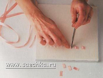 - Вставьте один конец ленточки в первую прорезь при помощи булавки или острого узкого лезвия и заправьте второй конец во вторую прорезь.