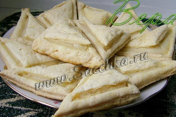 - Затем квадраты нарезать на треугольники, выложить на смазанный противень.