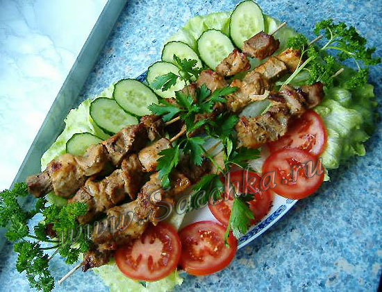 - Мясо без жилочек порезать на кубики, замариновать. Мариновка шашлыка должна быть продолжительна, можно оставить мясо на ночь в холодильнике.