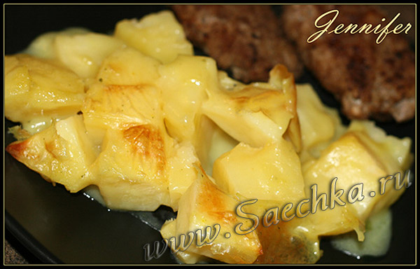 - Можно печь, накрыв форму фольгой, или без фольги. Если печь без фольги - то образуется золотисто-коричневая корочка. Если печь с фольгой, то надо следить, чтобы соус «Альфредо» не убежал с картошки и не залил вам духовку (некоторые сорта сыра уж очень поднимаются).
