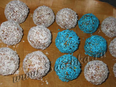 - Детскую смесь, кокос, шоколадные шарики, сливочное масло (нарезанное кубиками) смешаем до получения массы, из которой раскатаем колбаски и порежем их на небольшие овалы.