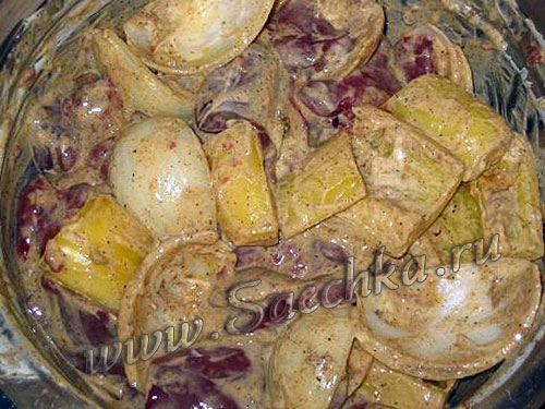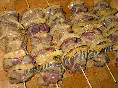 - Затем нанизать печень на шпажки чередуя кусочками перца и лука, нанизывать плотно, но не сильно а так чтобы печень не соскочила при переворачивании.