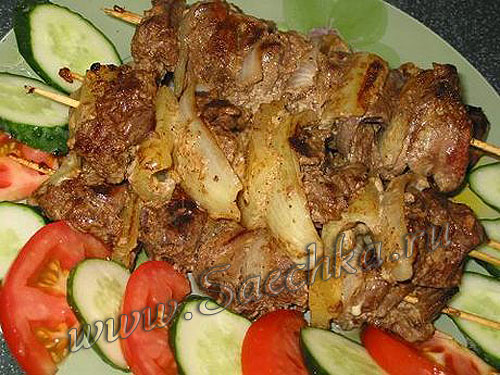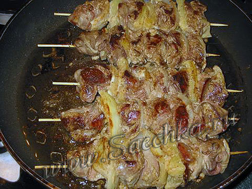 - В сковороде разогреть немного растительного масла, обжарить шашлык на среднем огне с двух сторон да румяного цвета.