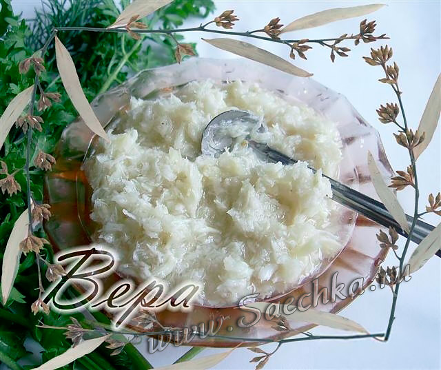 - Закрыть капроновой крышкой и хранить консервированный хрен до зимы в холодильнике.