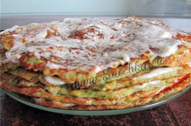 Кабачковый торт приготовлен из овощных блинчиков с сыром.