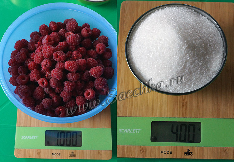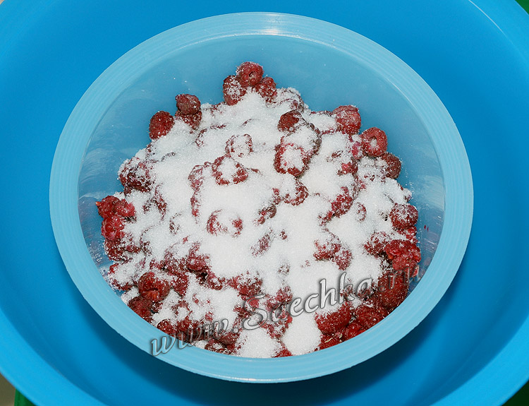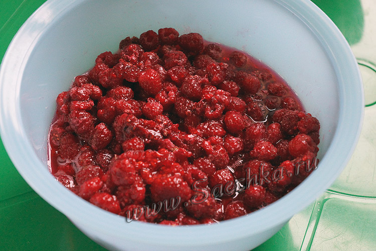 - Малину перебрать, засыпать половиной нормы сахара, оставить так пока она не пустит сок.