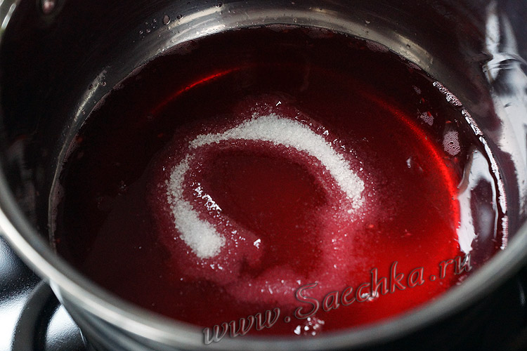 - Затем сок аккуратно слить в посуду (она должна быть с широкими краями), в которой будете варить джем, порциями положить в него остальной сахар.
