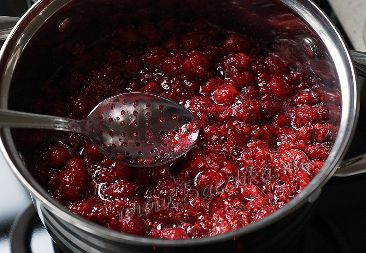 - Затем порциями опустить в сироп малину, помешать немного, варить на среднем огне 20-30 минут. Не больше, иначе джем потеряет цвет и аромат. Не забываем часто снимать пенку при варке!