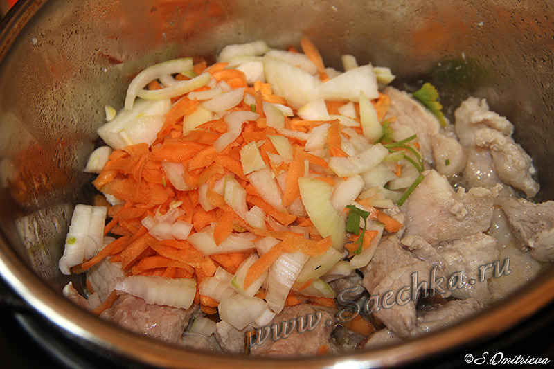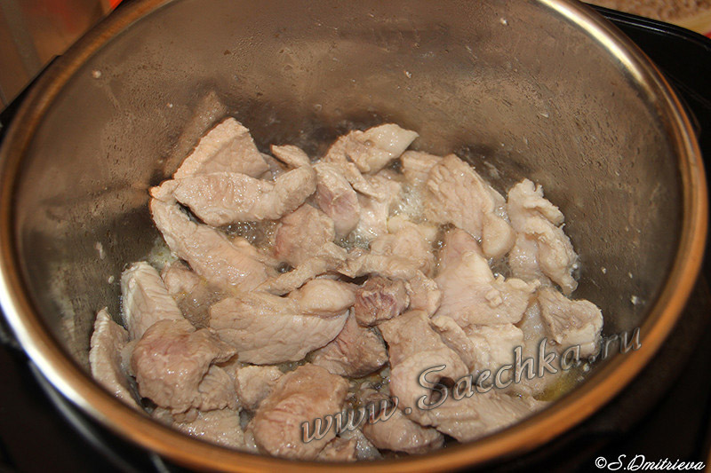 - Нарезаем свинину на кусочки любой формы среднего размера и выкладываем в чашу мультиварки "Штеба", куда предварительно положили маленький кусочек сливочного масла. Слегка обжариваем мясо в режиме "Жарка".