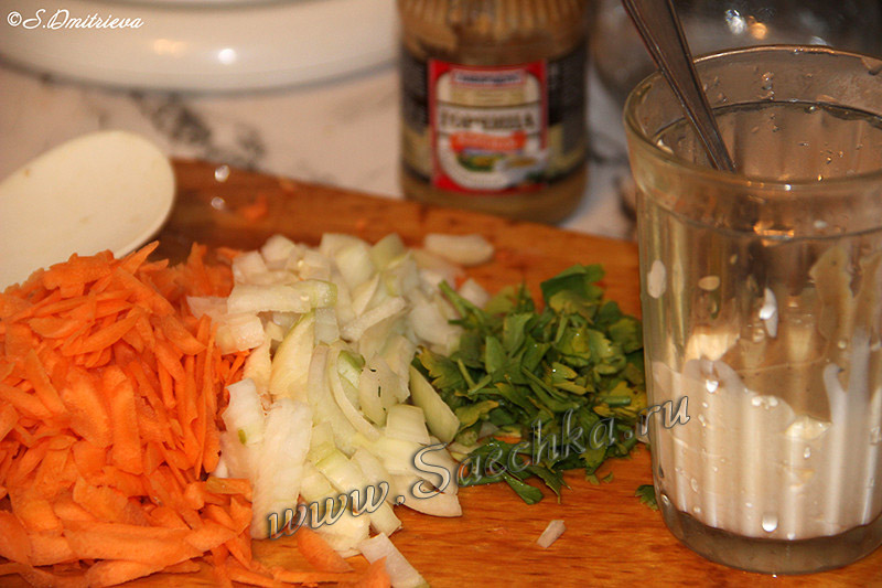 - А пока нарезаем лук и зелень, трём на крупной тёрке морковь: