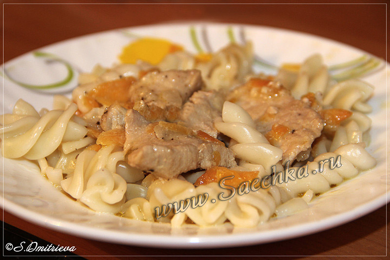 - Ну а подавать к столу можно тушеную свинину в майонезно-горчичном соусе с овощным салатом или практически с любым гарниром. У меня были макарошки. Очень вкусно!