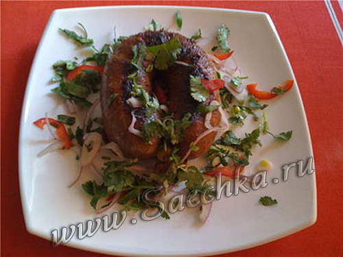 - Горячие, жаренные купаты выложить на тарелку, отрезать хвостик с нитками, а потом посыпать зеленью, луком, зернами граната и немного взбрызнуть гранатовым соком.