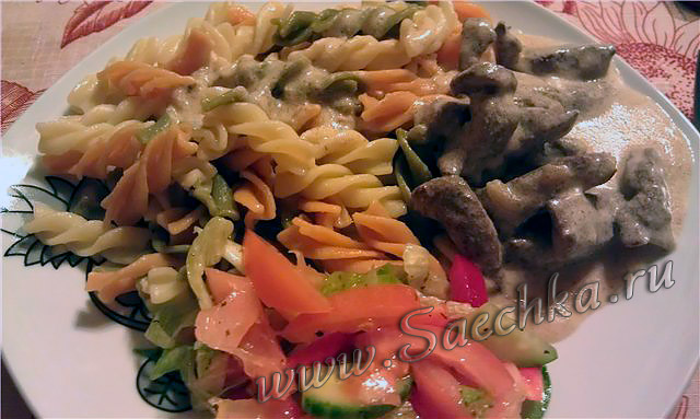 Печень по-бефстрогановски приготовлена со сметаной, молоком и мукой - получается очень вкусно.