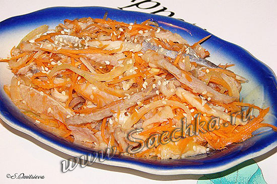- Сельдь откинуть на сито, а затем перемешать с овощами.