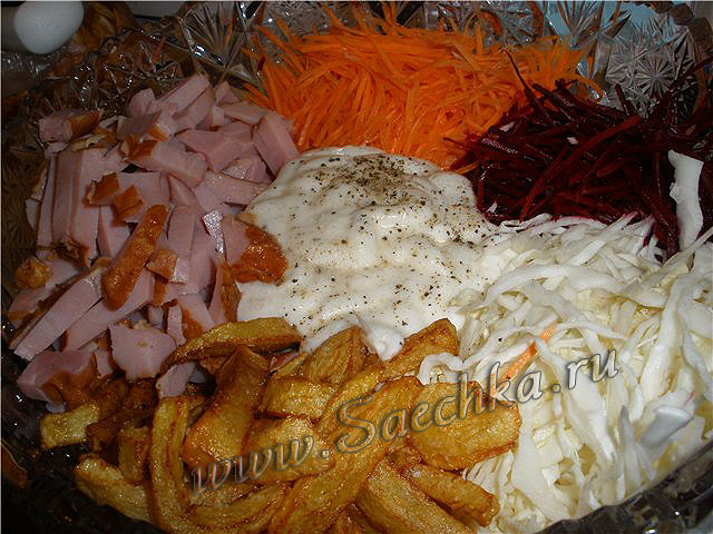 - Уложить ингредиенты салата с картофелем фри «Медео» в салатник, не смешивая: