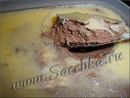 - Выложить паштет в мисочку, залить топлёным маслом.