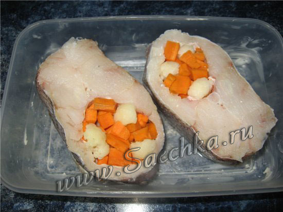 - Уложить треску в форму, в брюшко вложить овощи. Сверху посолить.
