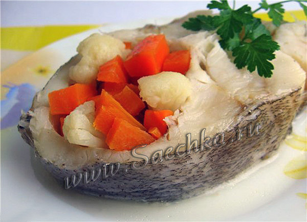 Фаршированная треска приготовлена с овощами в мультиварке. Диетическое питание.