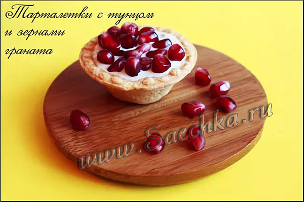 Тарталетки приготовлены с консервированным тунцом, мягким сыром и гранатом.