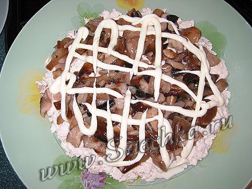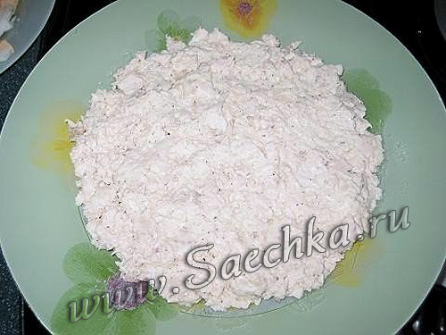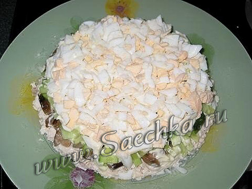 - Отварные яйца, огурцы и грибы мелко порезать. Грудку так же мелко порезать, поперчить, можно добавить немного приправы по вкусу, смешать с небольшим количеством майонеза.