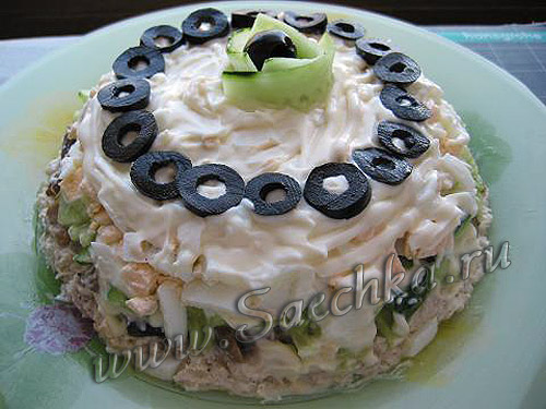 - Украсить вкусный салат на ваш вкус, убрать в холодильник на пару часов.