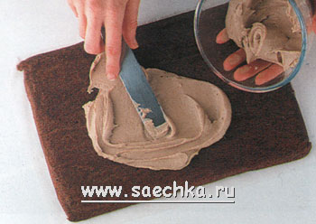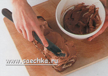 - Снимите с бисквита форму и отделите пергамент. Намажьте тесто ореховым пюре, сохранив 30 мл (2 ст.л.) на украшение, оставьте по краям свободные поля. Скатайте рулет и переложите его на поднос.