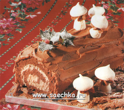 Традиционный французский рождественский торт с начинкой из орехового пюре, сдобренного медом и коньяком, покрытый шоколадной глазурью. Грибочки из меренги придают забавный вид этому праздничному торту, украшенному листиками остролиста.