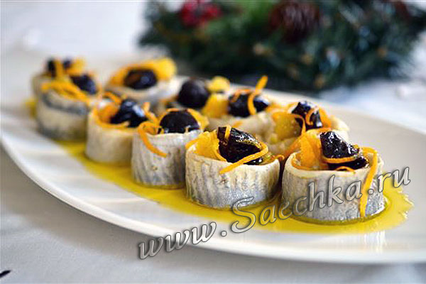 - Филе сельди слегка отбить. Смазать растительным маслом, положить на него натертую морковь, чернослив и лук, свернуть трубочкой.