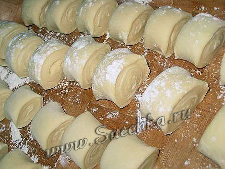 - Затем разделить тесто на 2 части, раскатывать тонкие лепёшки, смазывать сливочным маслом, скатать в рулетик и порезать на кусочки.