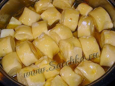 - Я, в принципе, штрули не смачиваю в масле, я их немного поливаю жиром, на котором жарилась курица. Только минут через пять, как они закипели, слегка поправляю их ложкой, чтобы не слиплись.