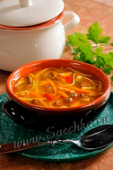 Суп приготовлен с домашней лапшой и куриной печенью.
