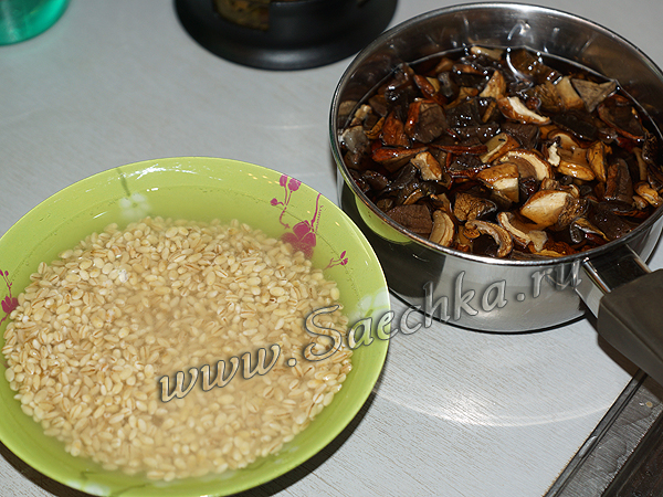 - Замачиваем по отдельности перловку и сушеные грибы на 3 часа.