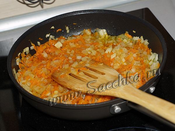 - Обжариваем на подсолнечном масле мелко нарезанный лук и морковь.