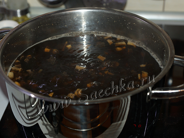- Затем грибной настой сливаем в кастрюлю, доливаем воду. Грибы промываем и кладём их в кастрюлю. Добавляем соль и перец. Варим 1 час.