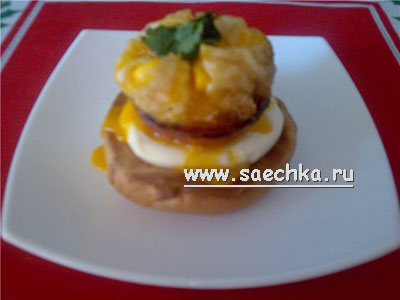 - На половинку булочки положить немного плавленого сыра, на него помидор и на помидор яйцо.