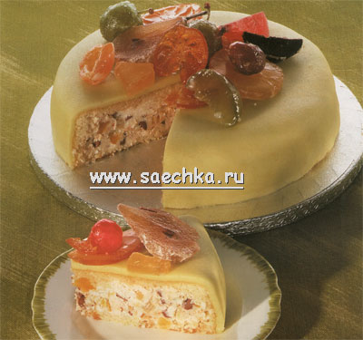 Этот торт с острова Сицилия, где сладости издавна любят покрывать миндальной пастой и украшать экзотическими засахаренными фруктами. Начинка - творожная масса с цукатами и шоколадом.