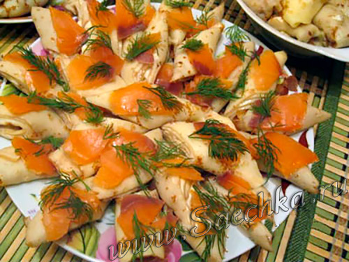 Налистники приготовлены на молоке с начинкой из сыра и красной рыбы.