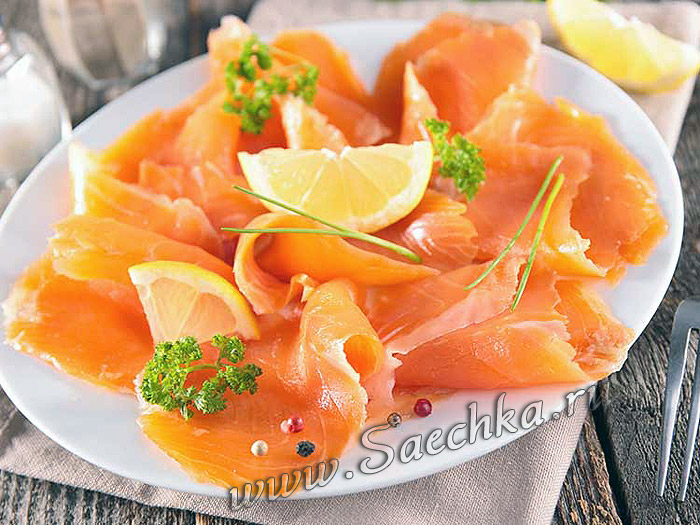 - Лосось семужного посола нарезать тонкими ломтиками.