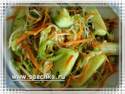 - Остальные ингредиенты натереть на терке или нарезать соломкой, сложить в маринатор, заправить приправами, положить огурчики и мариновать 9 минут.